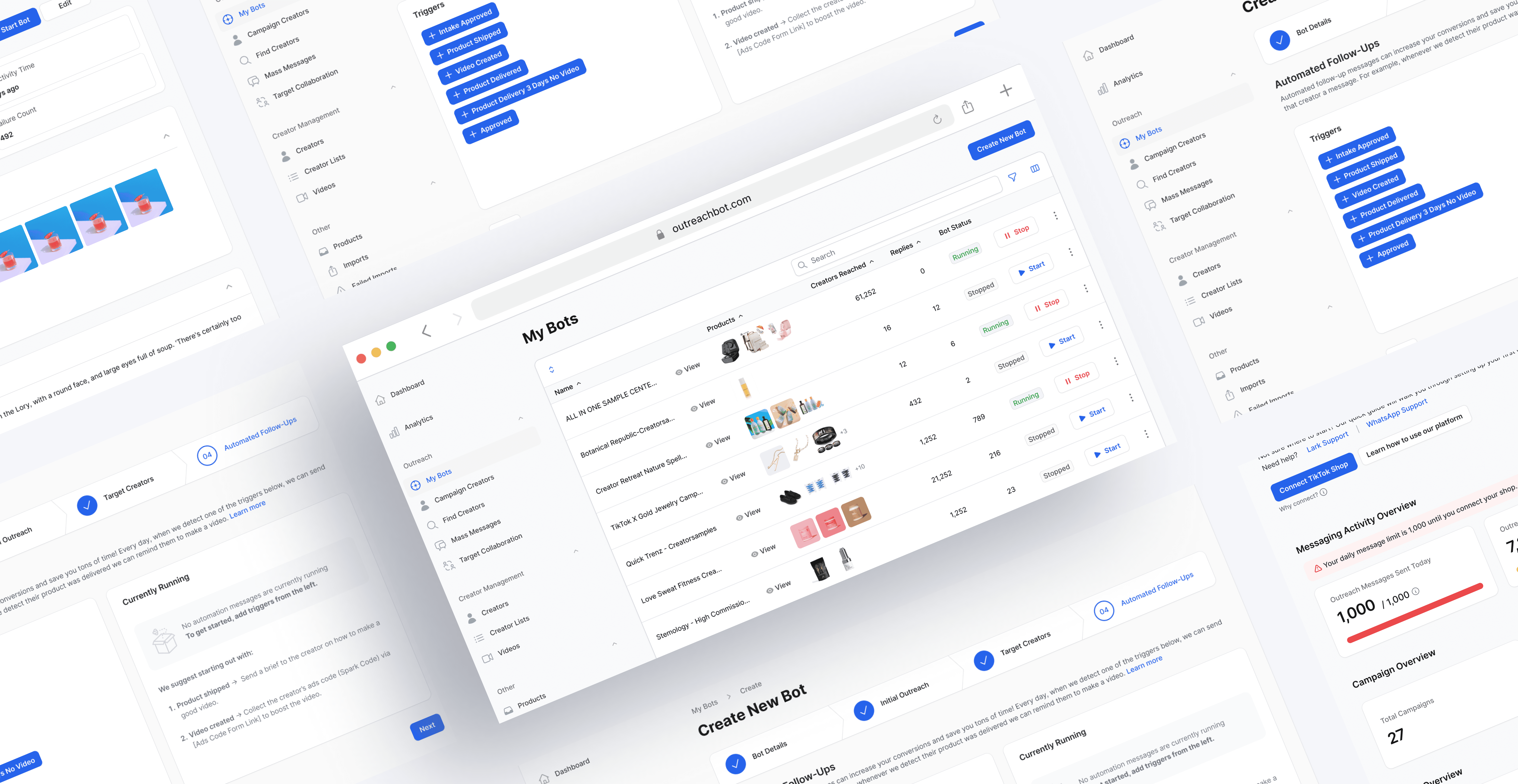 As part of the Outreach Bot System, I designed the Bot Builder: a clear 4-step setup flow and a streamlined list view built to support our campaign managers.